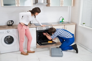 Woman Looking At Worker Repairing Oven